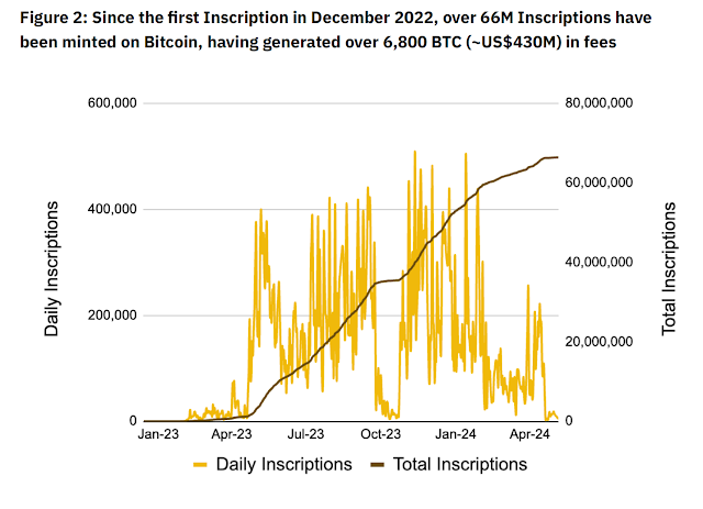 역사적으로 트랜잭션 수수료는 전체 수익의 상대적으로 제한된 비율을 차지했지만, 작년 오디널스, 인스크립션 및 BRC-20 토큰의 도입 이후로 이 비율은 증가하고 있습니다.